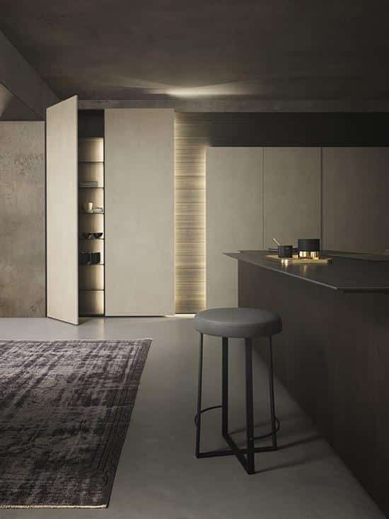 Lineare e minimale Skill grazie a nuovi materiali e superfici permette di personalizzare la progettazione dell’ambiente cucina adattandolo ad ogni esigenza senza dover rinunciare alla sua forte personalità. Gli spessori sottili caratterizzano tutto il progetto Skill: dalla penisola, ai frontali, ai fianchi di finitura. L’abbinamento di Skill con la libreria Blade realizza un progetto estremamente raffinato. Di grande impatto la nuova colonna funzionale per piccoli elettrodomestici. Il sistema progettuale consente la personalizzazione anche dell’interno della colonna in milltech eucalipto.